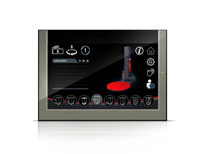 Oltre ad avere la possibilità di regolare il numero di giri sulla parte bassa e alta del pallet, è possibile regolare anche l'avvio graduale della tavola tramite inverter. Le macchine per imballaggio pallet della serie Tornado tavola aperta sono dotate di PLC e display touch screen a colori da 7,2 che consentono di regolare ulteriori parametri come la velocità di salita e discesa del carrello, ritardo lettura fotocellula, contacicli, ecc .