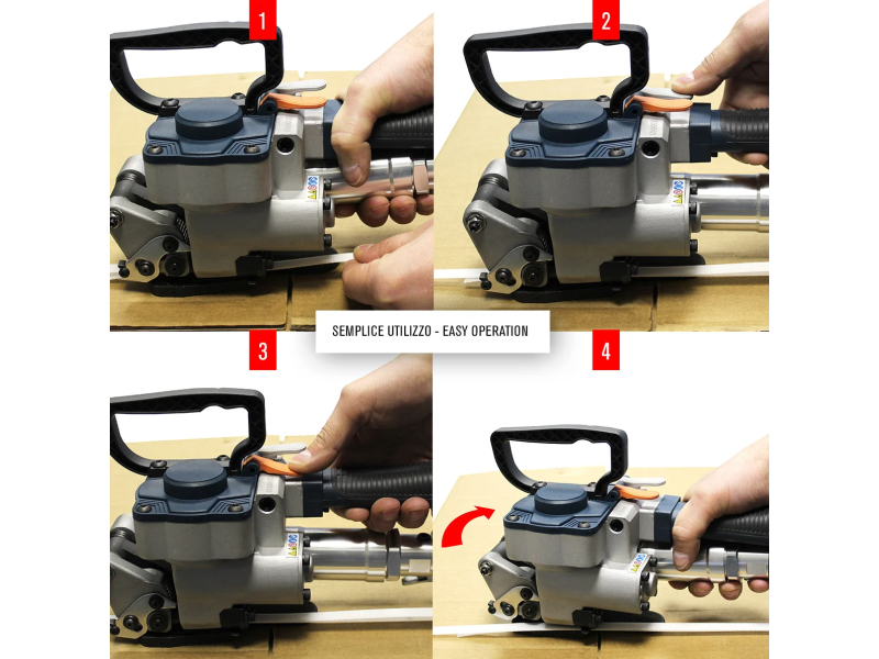 L’operatore deve semplicemente inserire i due lembi di reggetta sovrapposti nell’apparecchio, premere un pulsante per effettuare il tensionamento, un secondo pulsante per ottenere la saldatura a vibrazione ed infine un terzo pulsante facilita l’estrazione del tendireggia.
